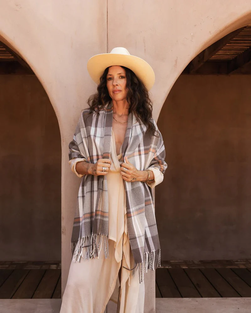 - Timeless taupe check pattern with warm accents
