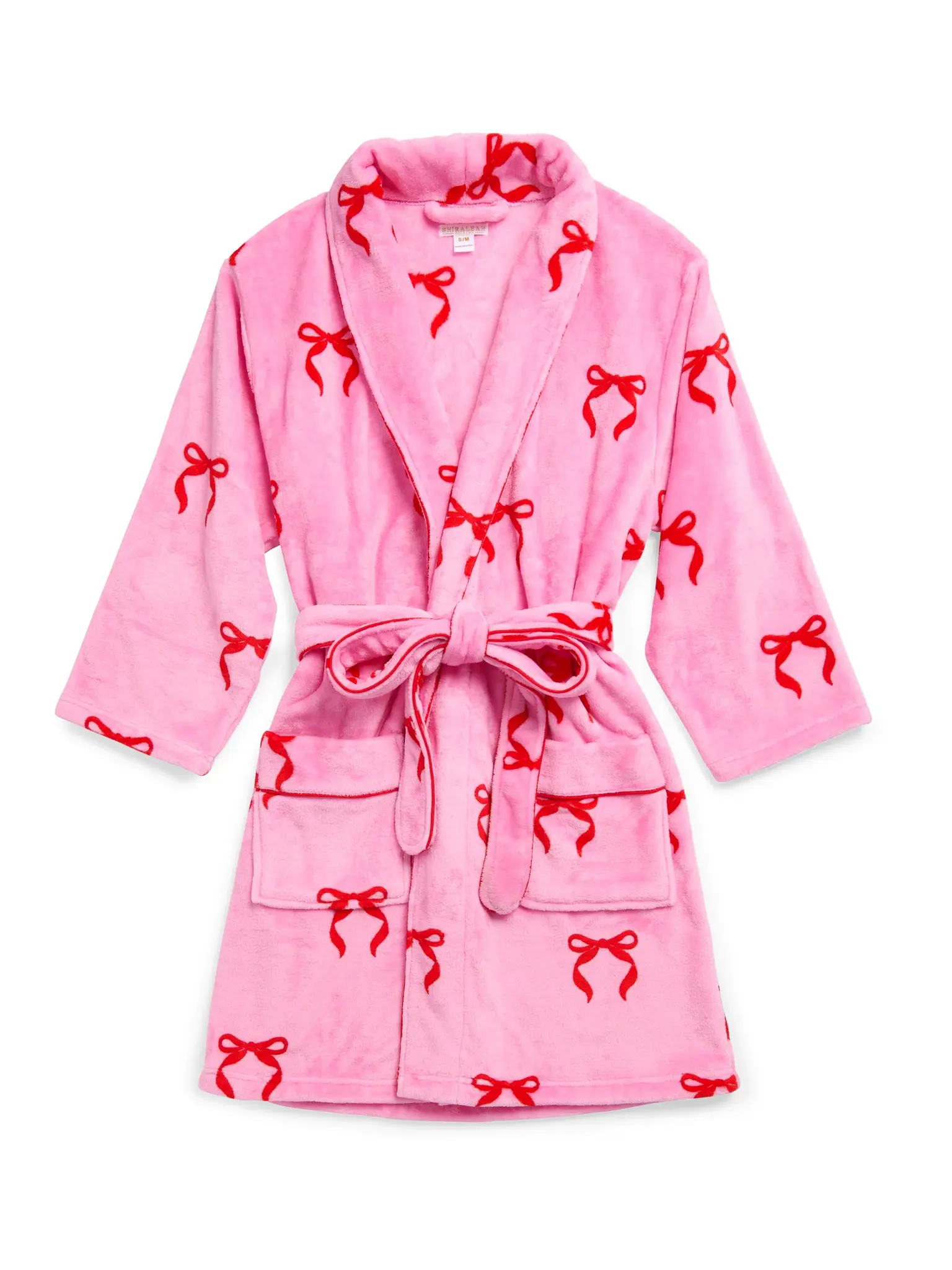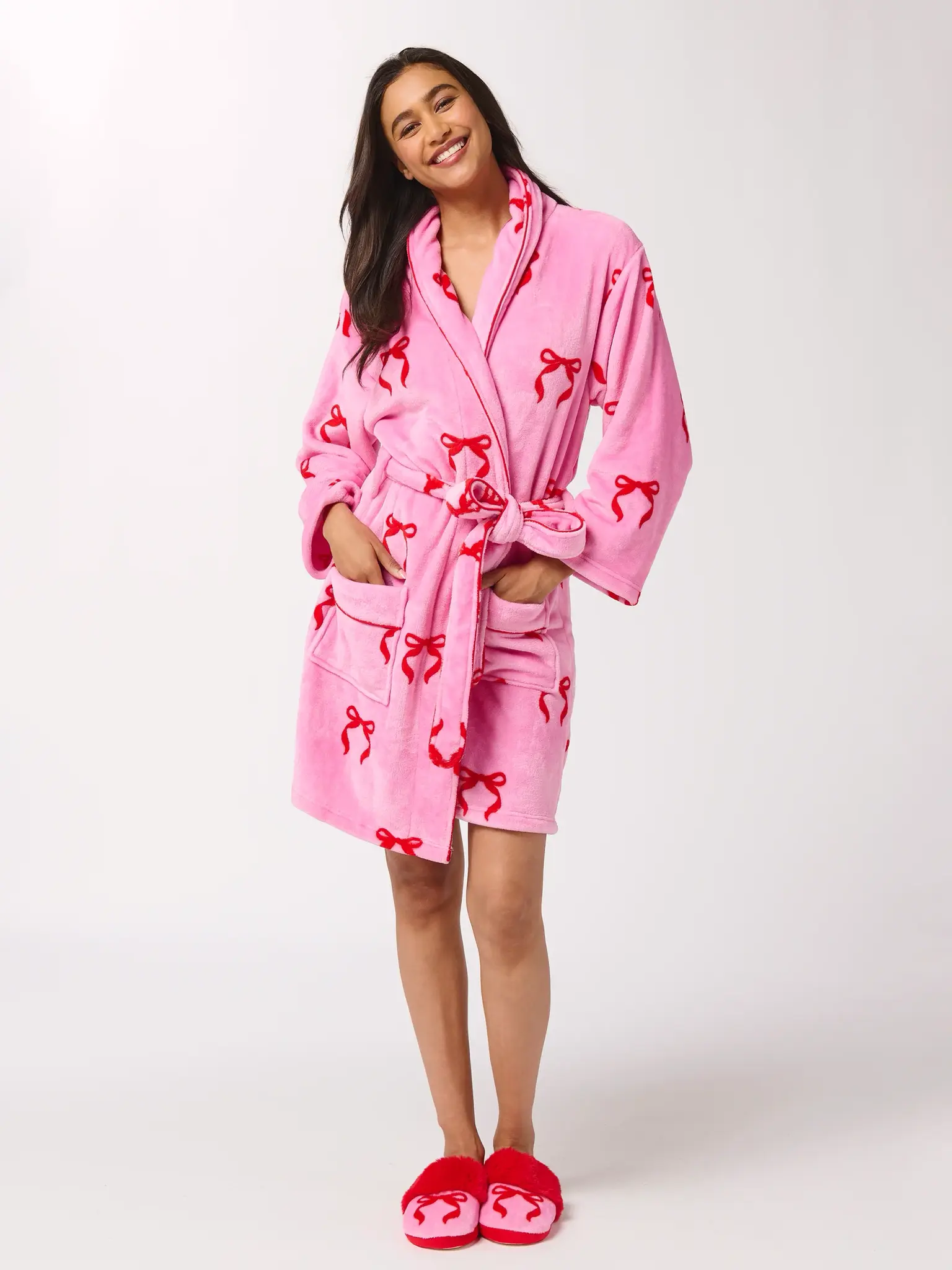 Bow Robe Pink $84.99 Excl. tax In stock (4) S/M L/XLSize: *S/ML/XLAdd to cartDescriptionWrap yourself in playful coziness with our Bow Robe, the perfect piece for lounging in style. Made from super soft fleece, this robe features a dreamy pink hue sprinkled with bright red bow prints for a fun, feminine touch.