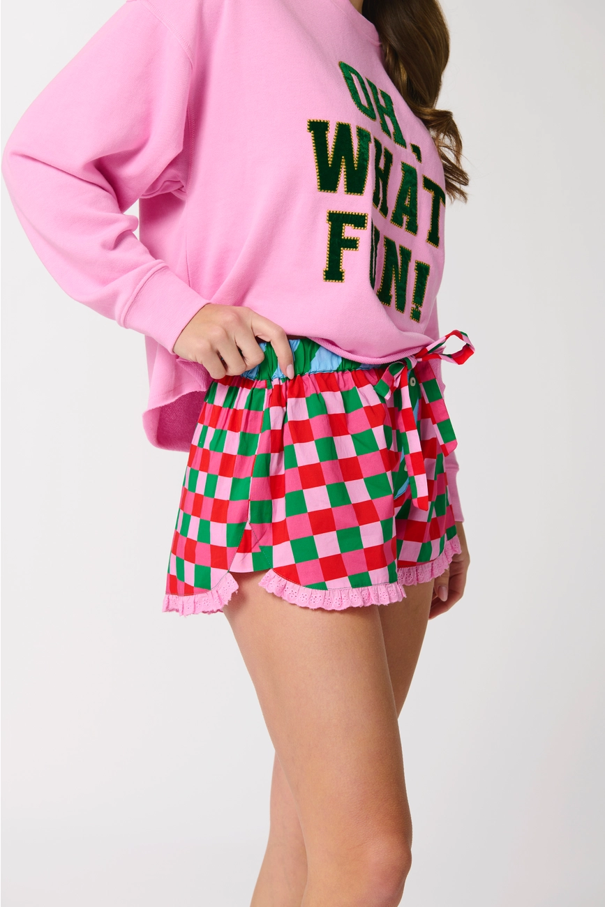 Checkered Boxer Shorts $47.99 Excl. tax Out of stock (0) S M L XLSize: *SMLXLOut of stockDescriptionGet into the holiday groove with these Checkered Boxer Shorts, featuring a 1.5" inseam and an all-over pattern that’s equal parts festive and fun. With sweet lace trim and a striped waistband, these shorts bring whimsy to your winter wardrobe.