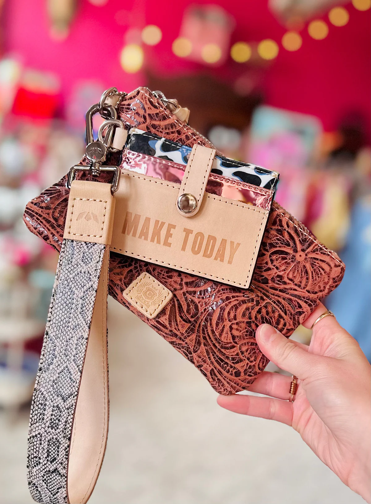 - Wynn textured snake print wristlet
