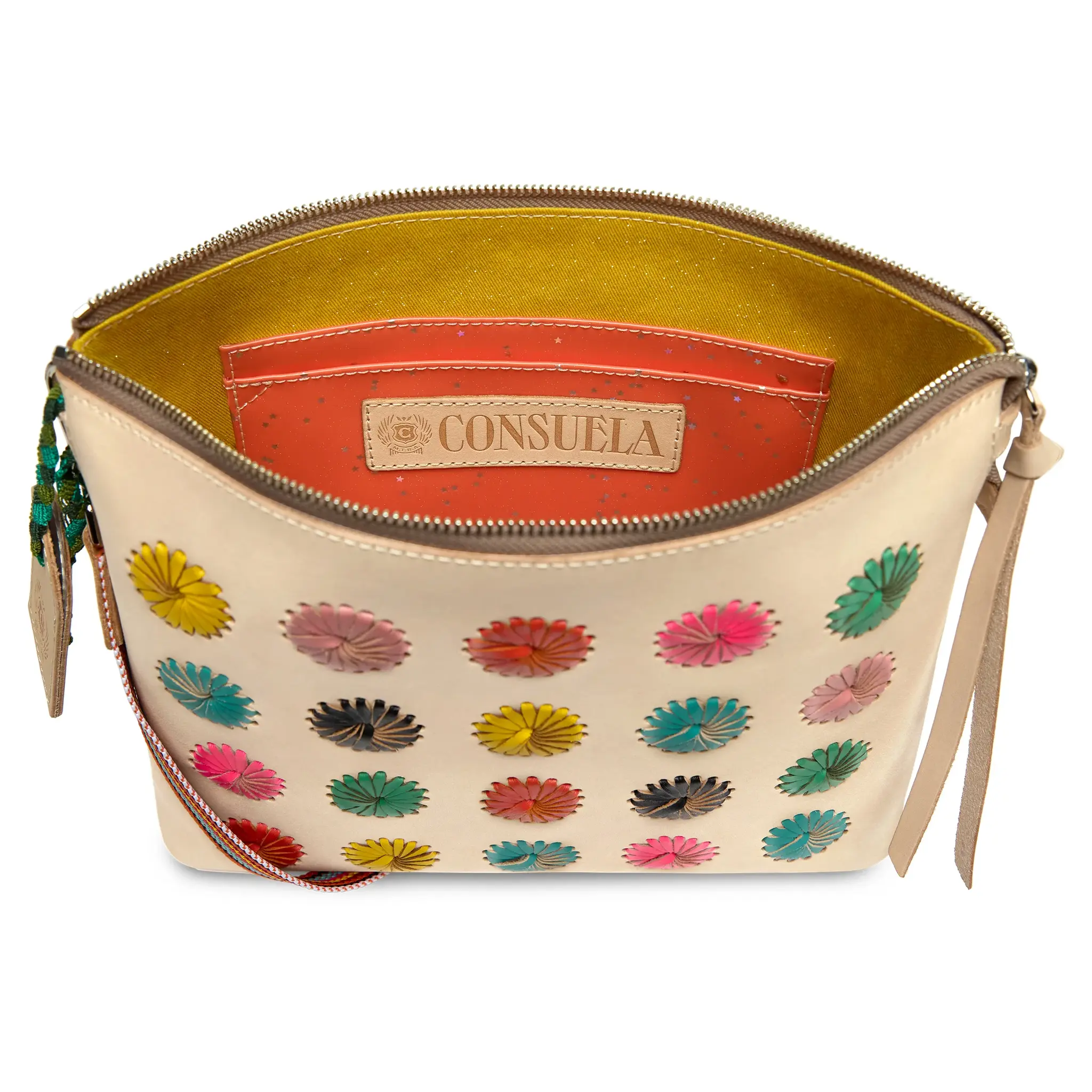- Hand-laced, multi-colored leather pinwheels on Diego leather exterior