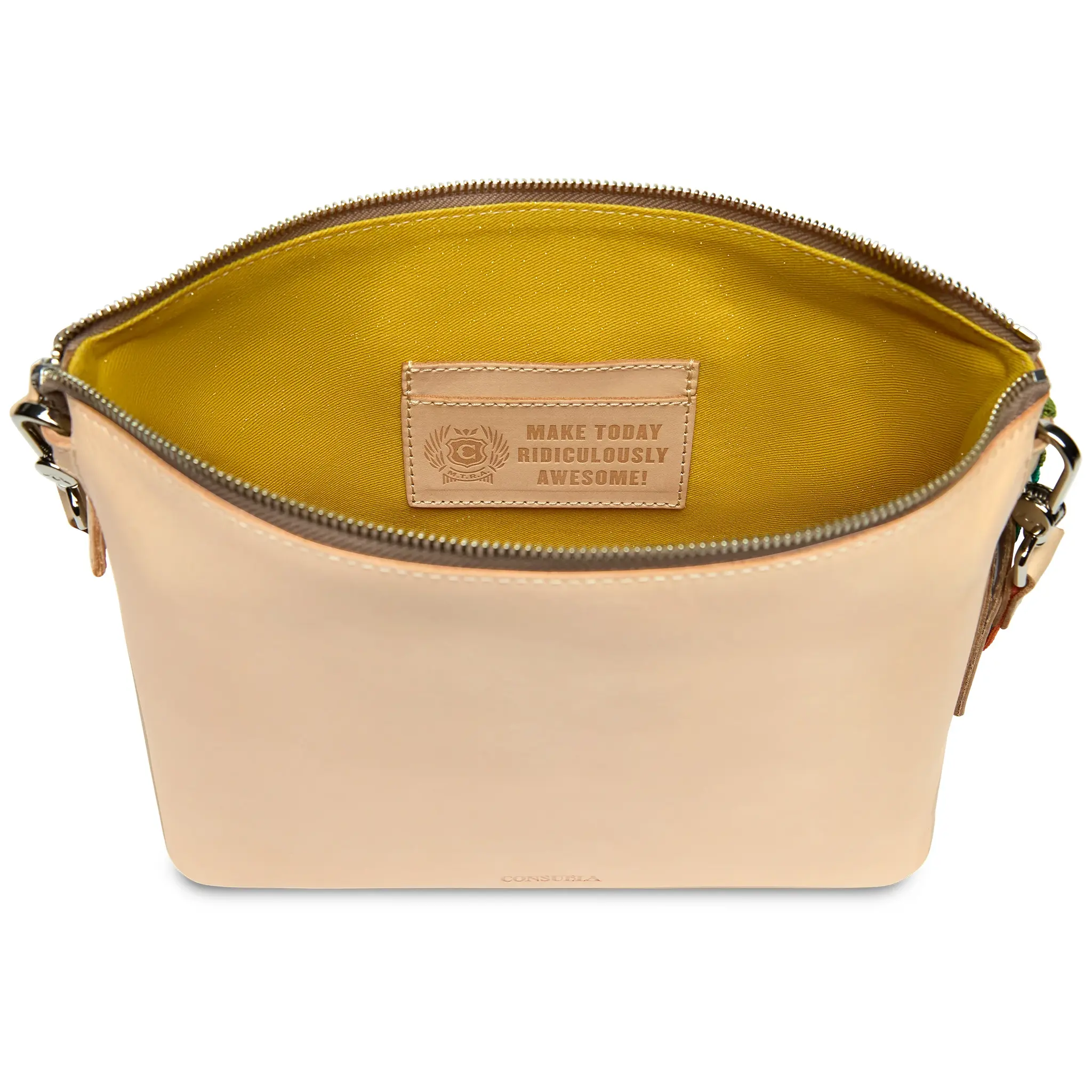 - Includes detachable and adjustable woven crossbody strap