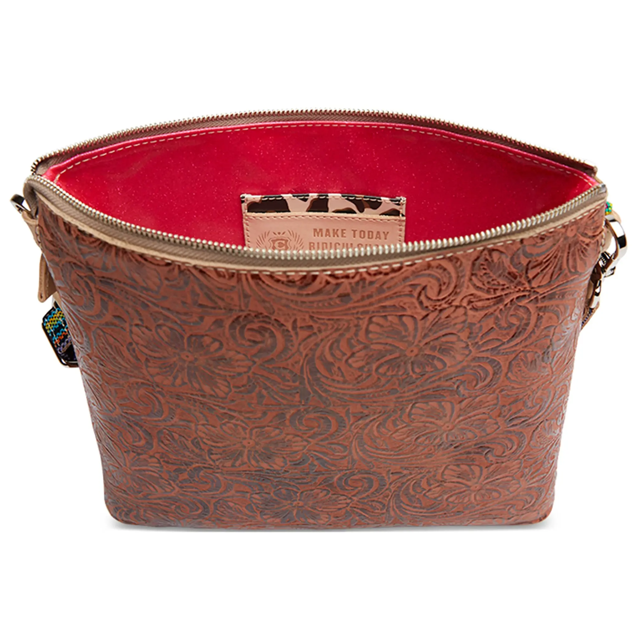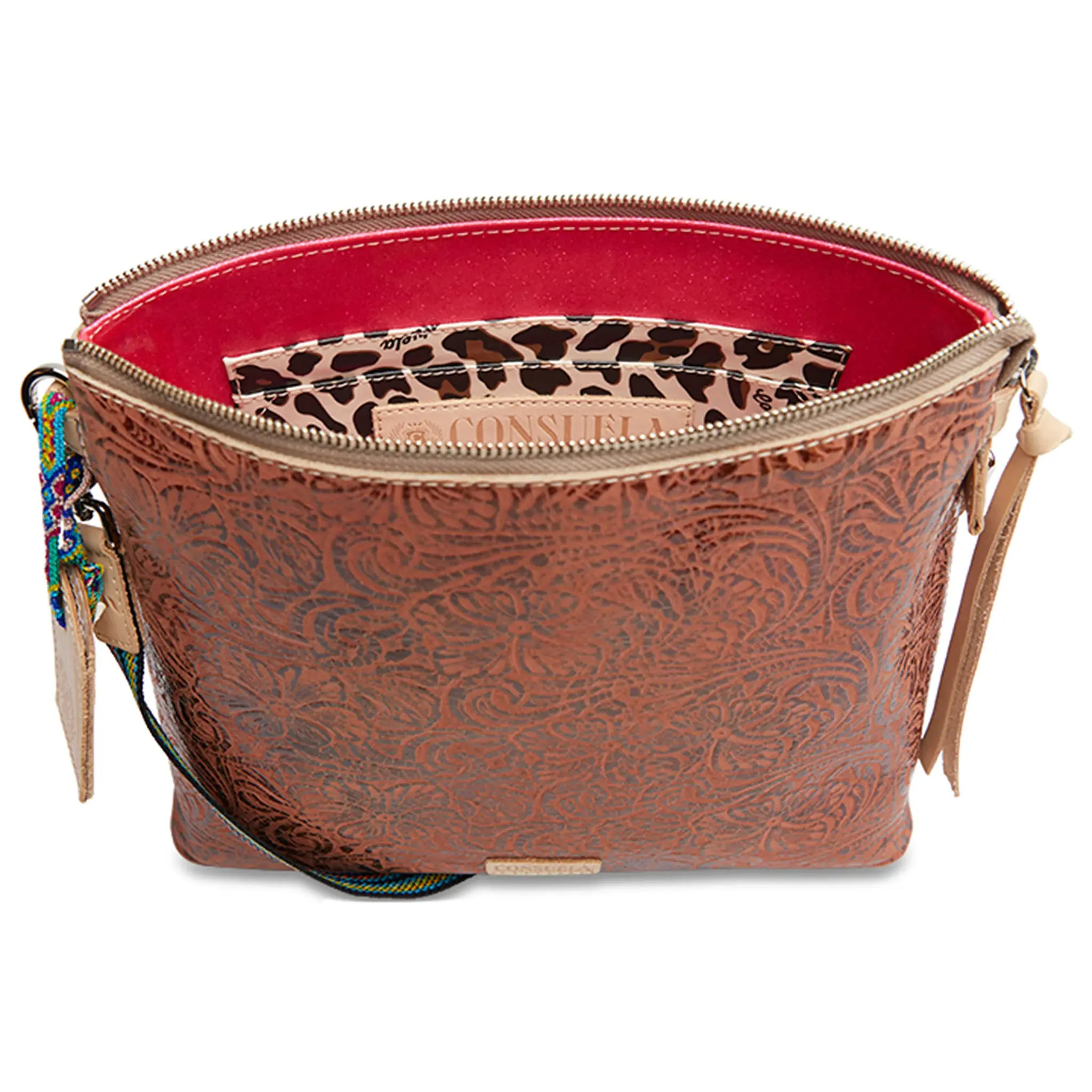 - Includes detachable and adjustable woven crossbody strap