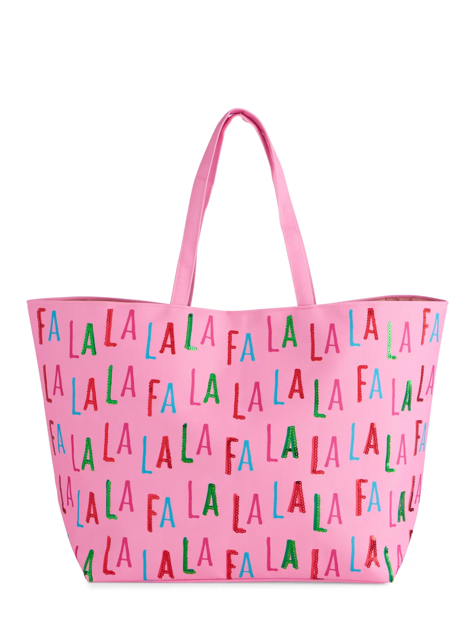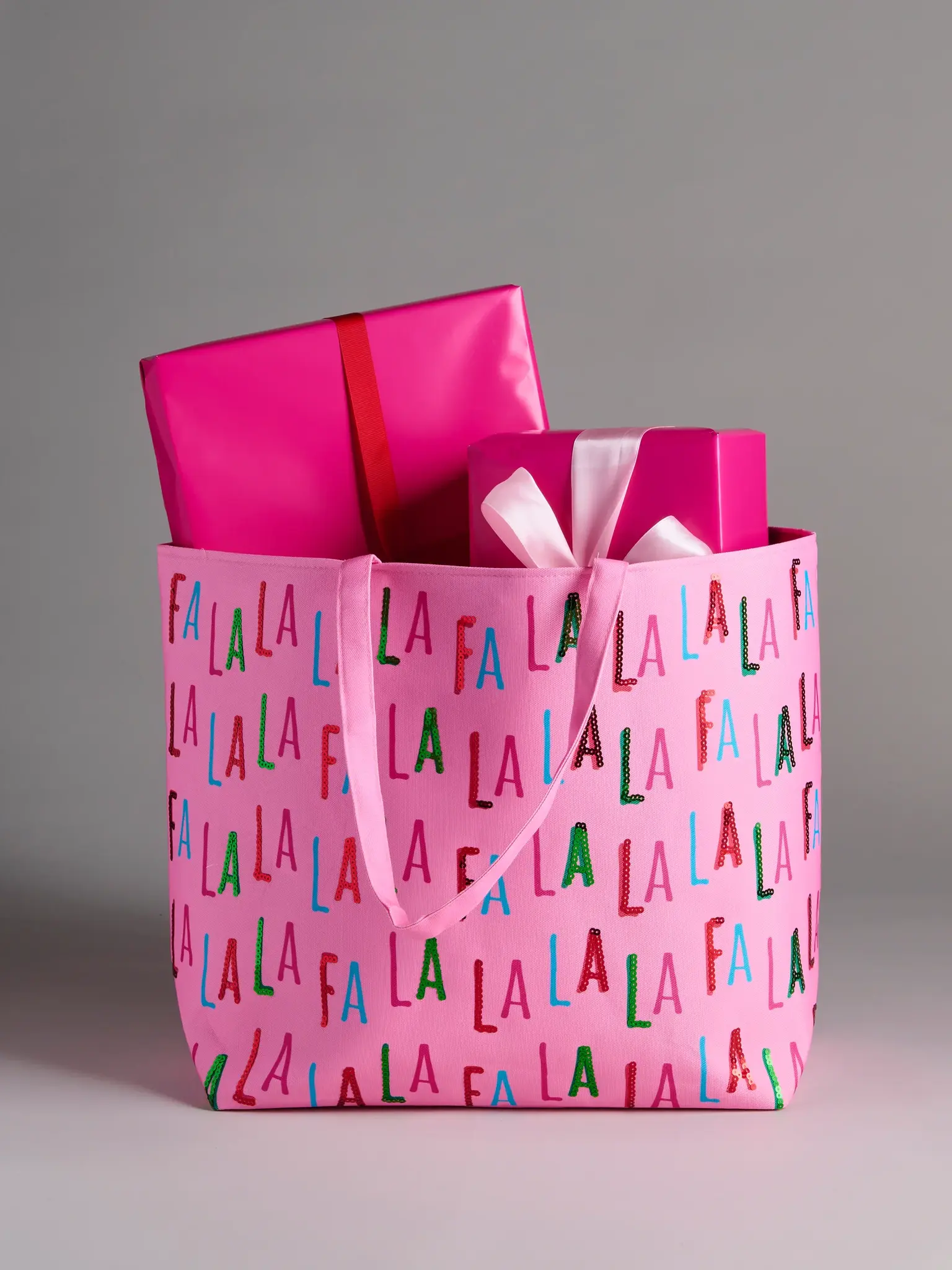 Fa La La Gifting Tote Pink $37.99 Excl. tax In stock (3) Add to cartDescriptionSpread some holiday cheer with the “Fa La La” Gifting Tote, the perfect carryall for all your festive errands and gifting needs. This oversized tote features bold “Fa La La” lettering with pops of sequin sparkle for a playful, eye-catching touch.