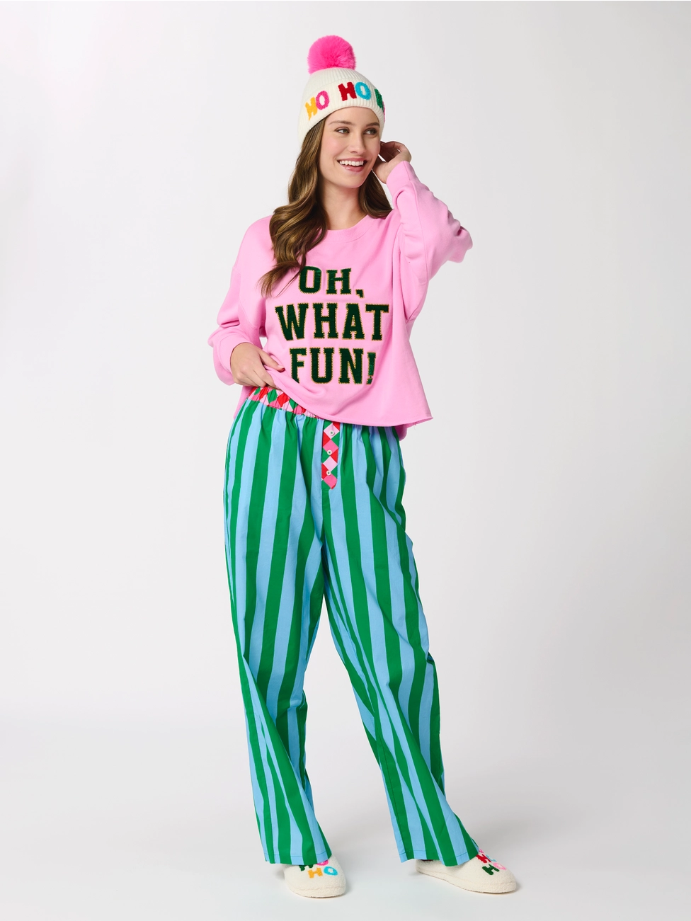 Festive Stripe Boxer Pants Green $64.99 Excl. tax In stock (2) S M L XLSize: *SMLXLAdd to cartDescriptionBring bold, joyful energy to your holiday loungewear with the Festive Stripe Boxer Pant! These relaxed-fit pants feature candy-colored vertical stripes and a colorful, diamond-print waistband with faux buttons for a playful twist.