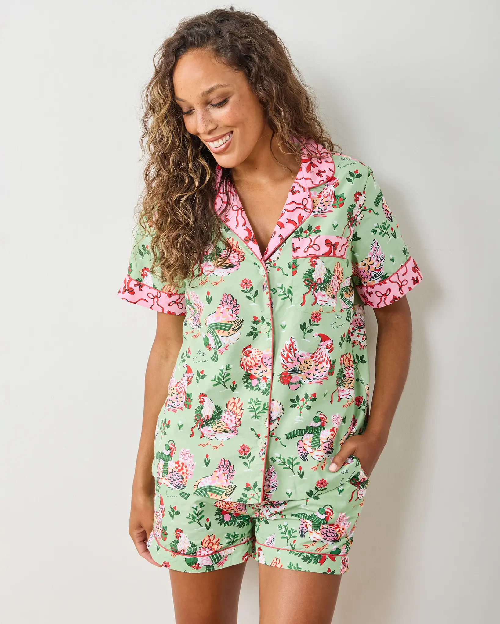 - Fit: Button-down top with relaxed fit and comfortable silhouette. Mid-rise shorts featuring elastic waistband, adjustable drawstring, and 2 ¼" inseam.