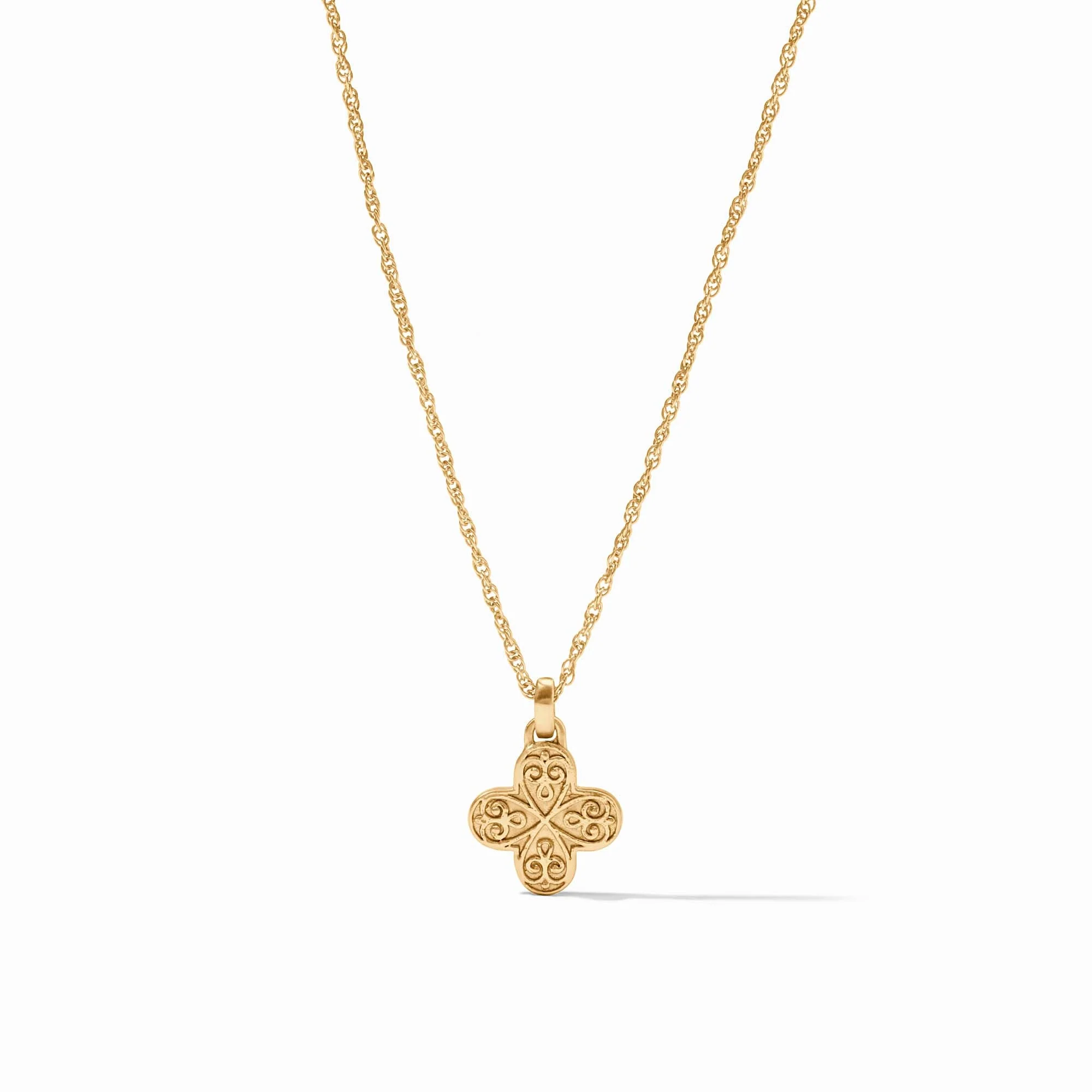 Julie VosMalta Corinth Delicate Necklace Pearl $125.00 Excl. tax In stock (1) Add to cartDescriptionA domed pearl sits at the center of this golden pendant's rounded cross design, featuring intricate floral heart filigree and dangling from a delicate rope chain.