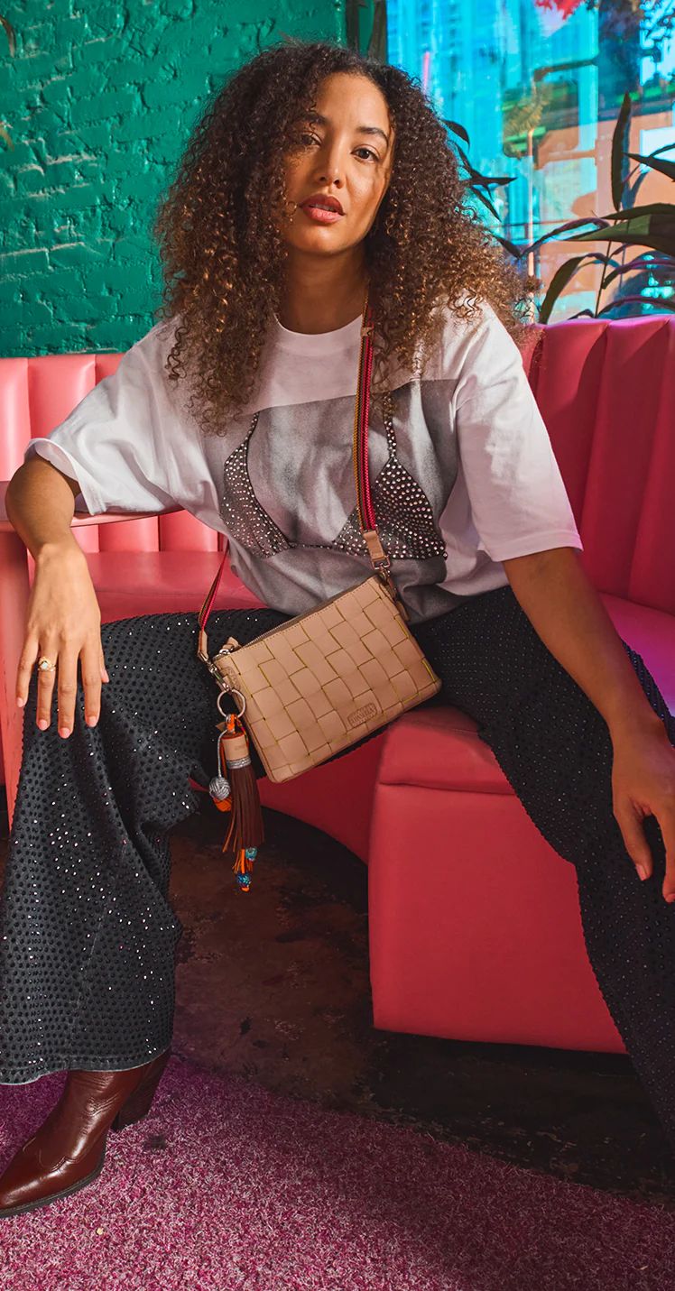- 8 ¼" (W at the base), 9 ¼” (W at the top) x 5 ¾” (H) x 2" (D), 14 ½”-27 ½” adjustable crossbody strap drop
