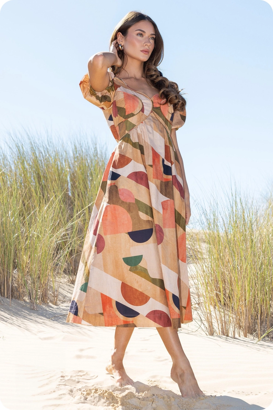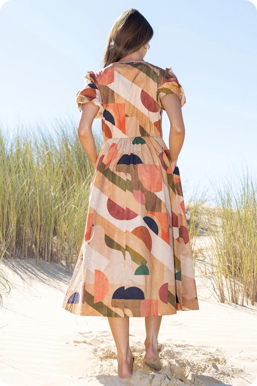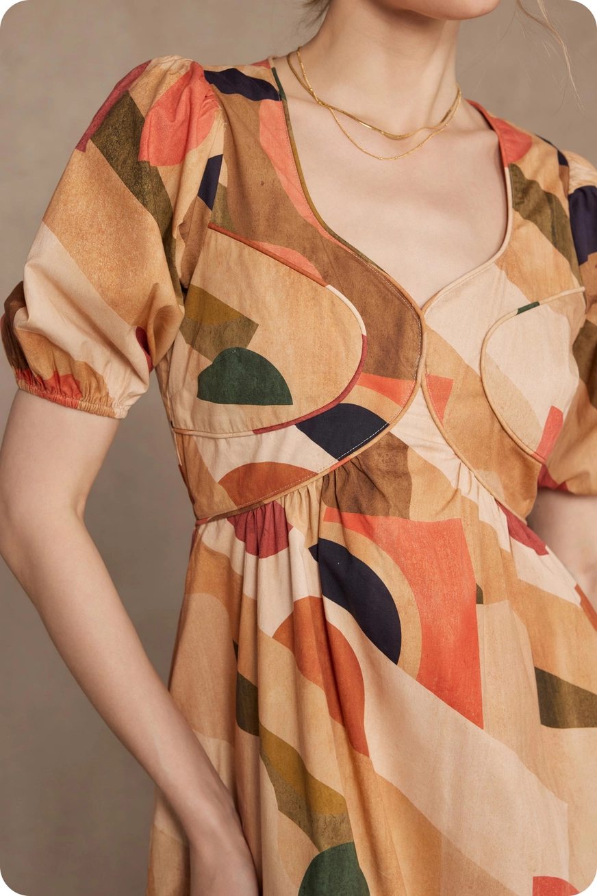 Multi color piping detail midi dress in an exclusive abstract brushstroke geo print on poplin fabric.