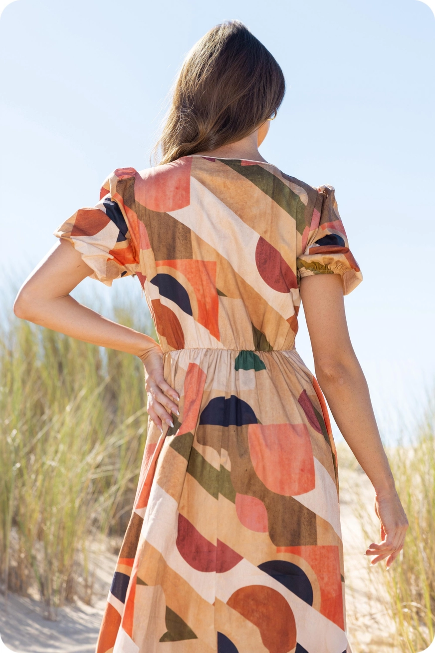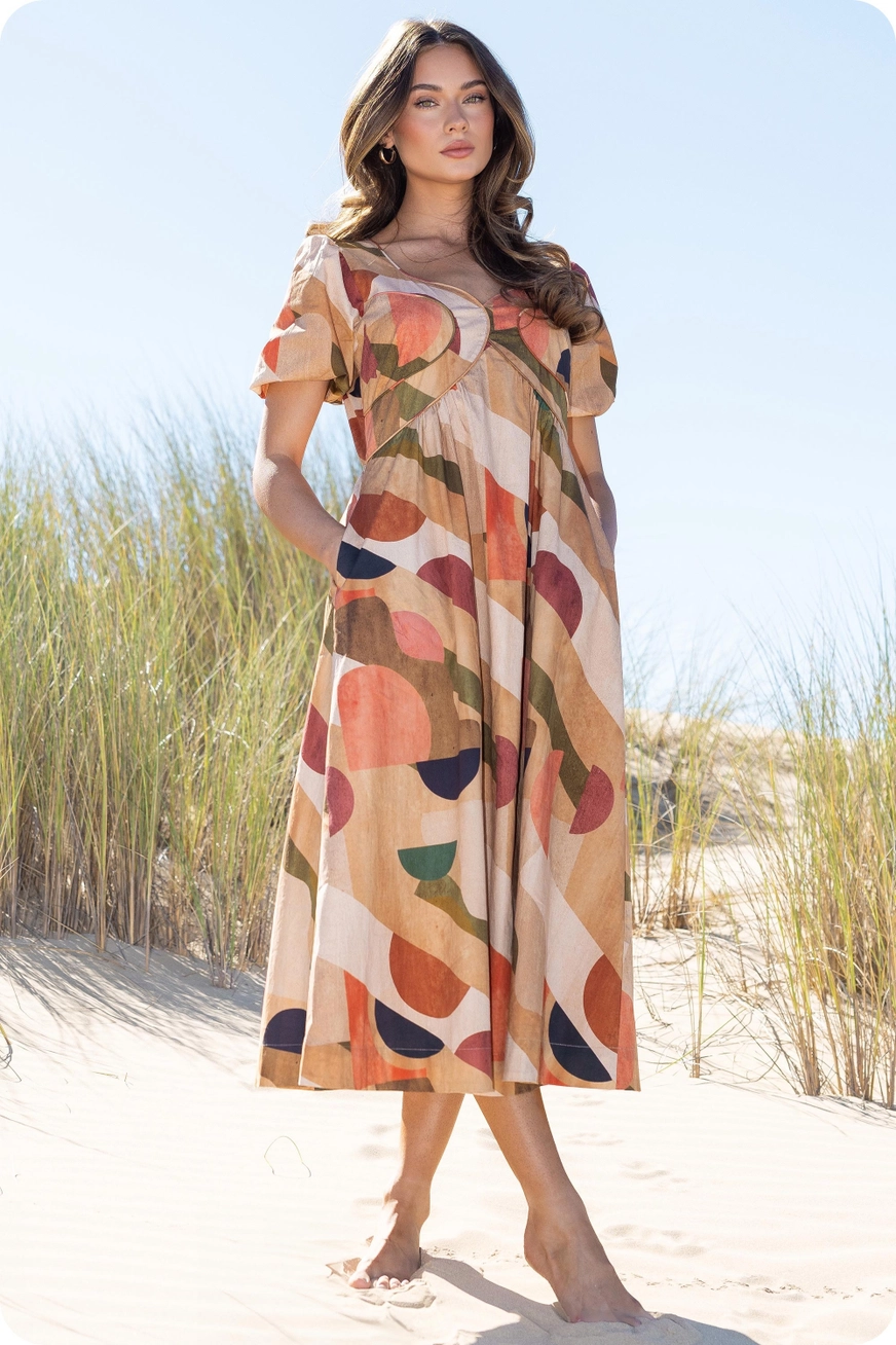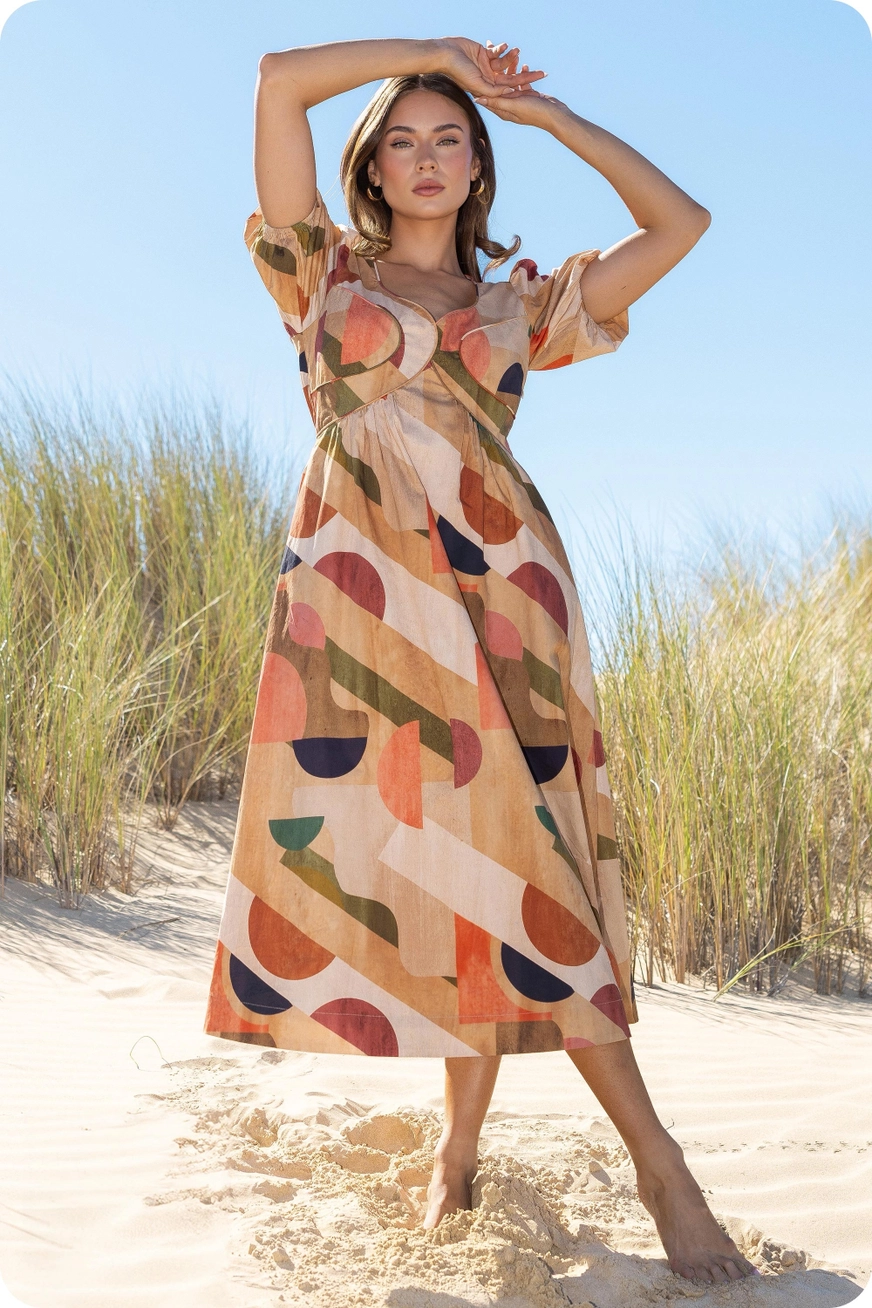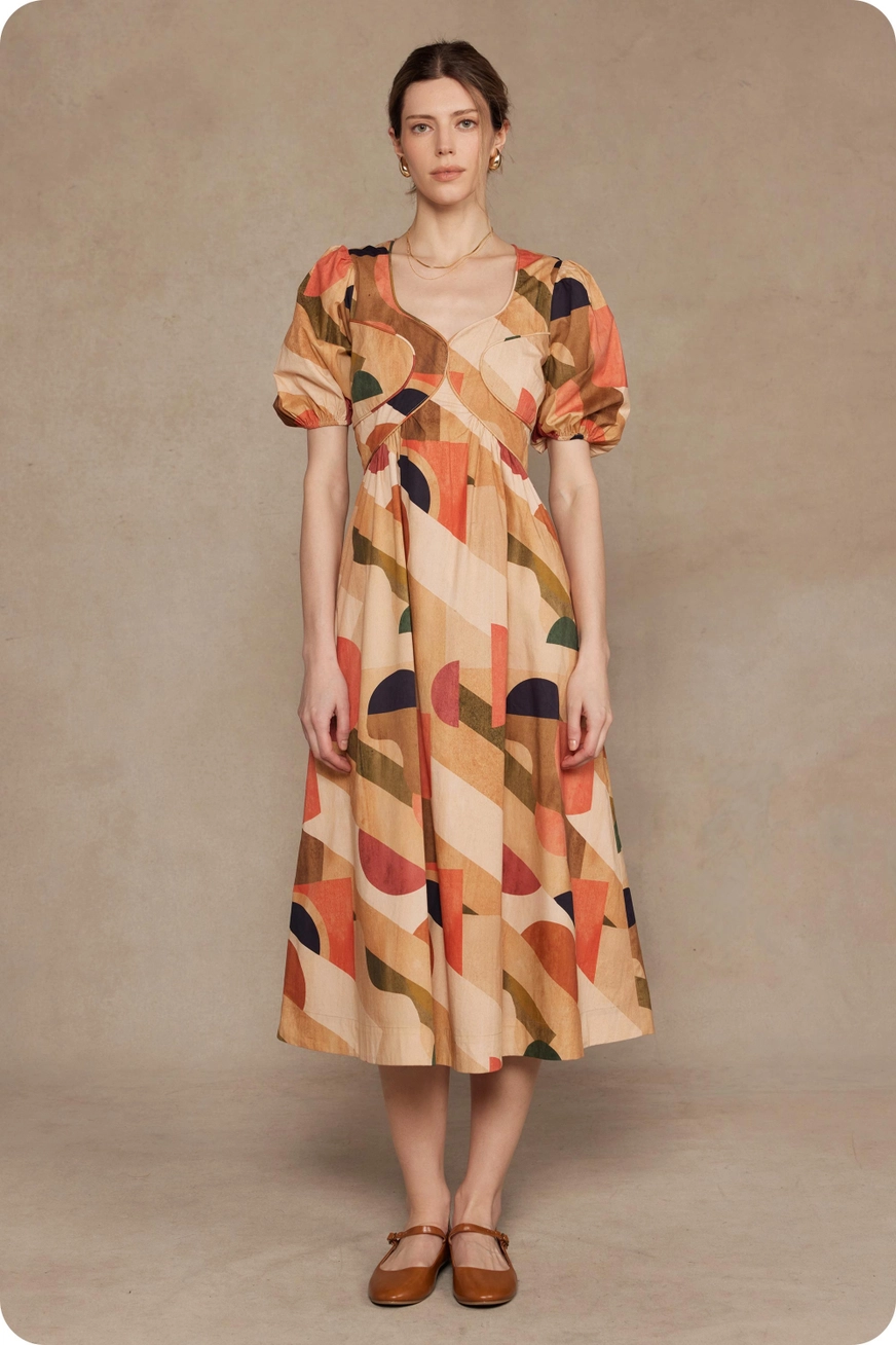 Multi color piping detail midi dress in an exclusive abstract brushstroke geo print on poplin fabric.