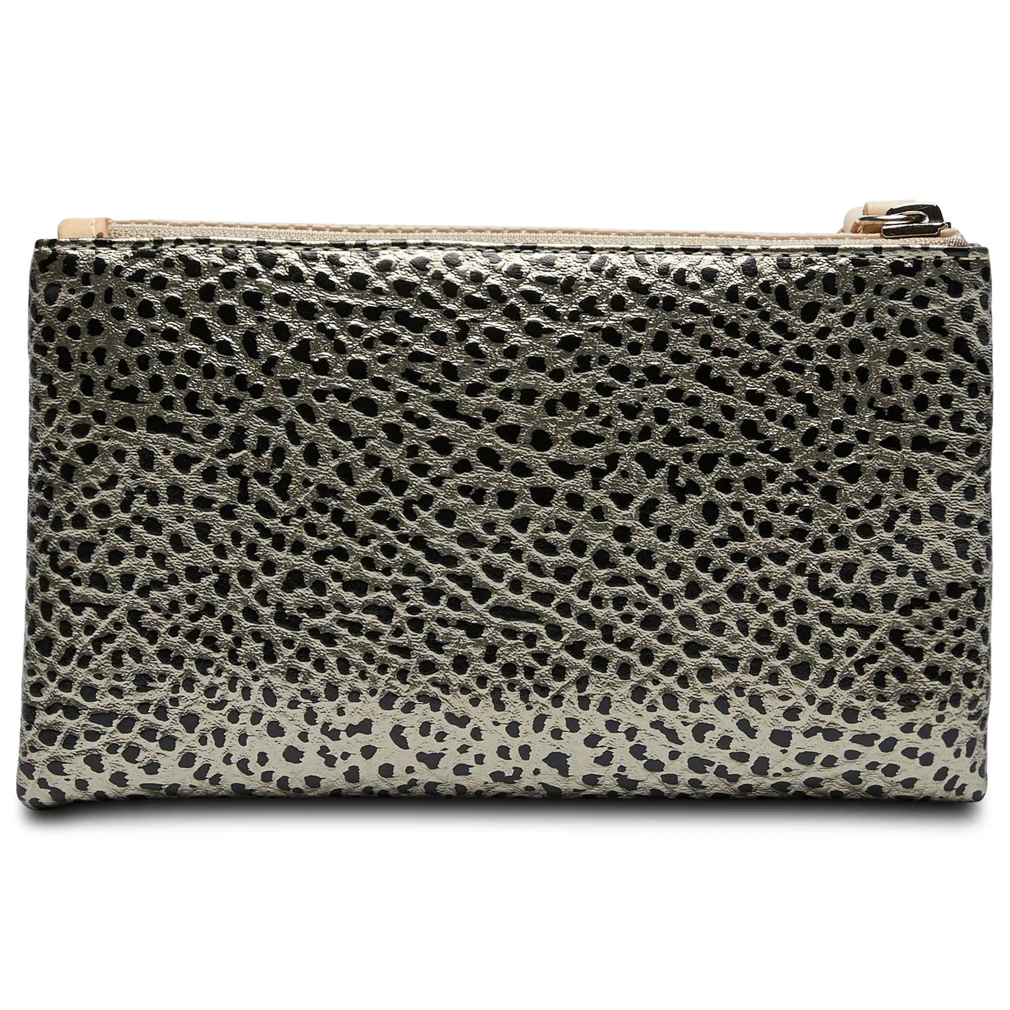 - Pewter metallic textured synthetic exterior with zip side pocket