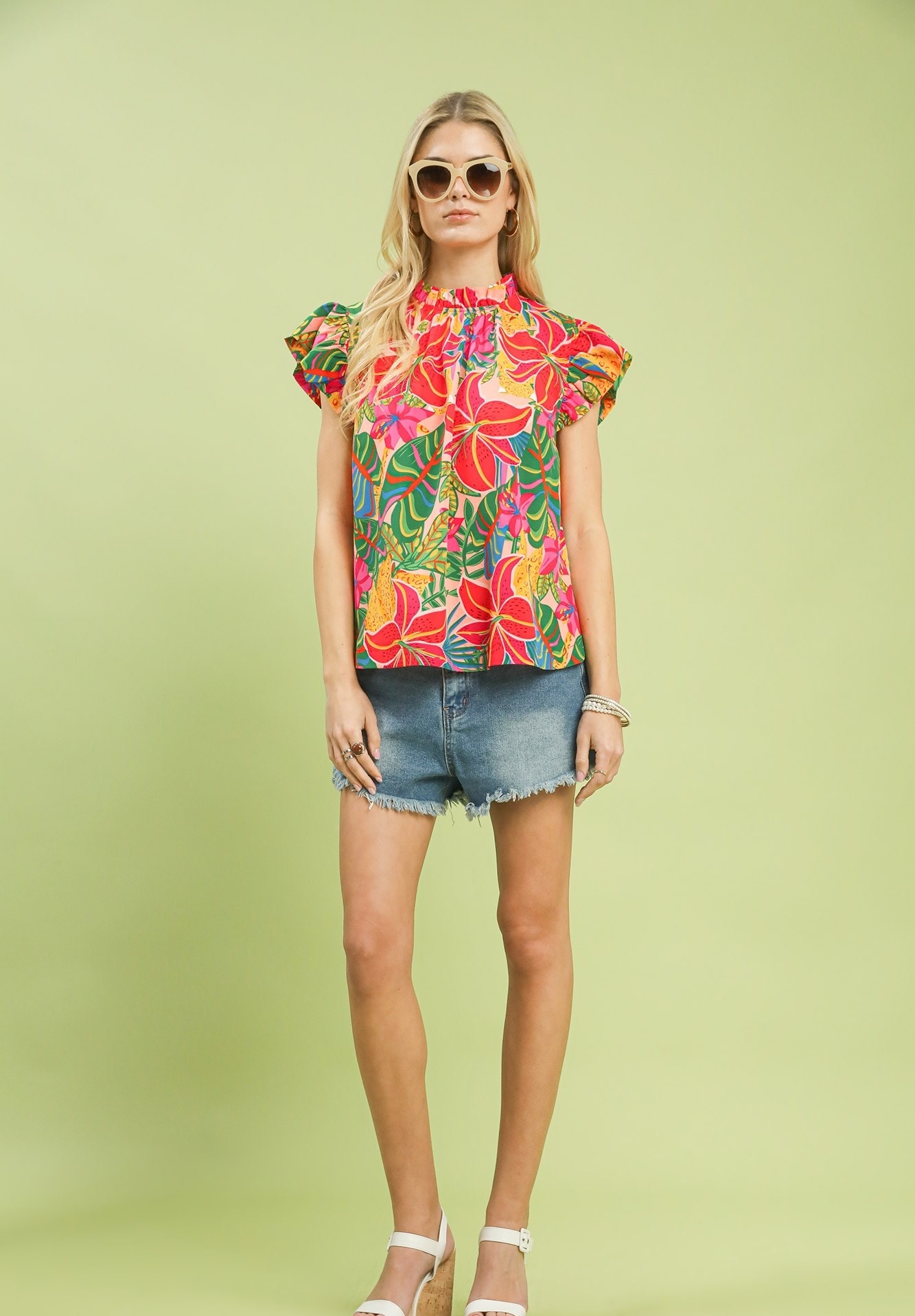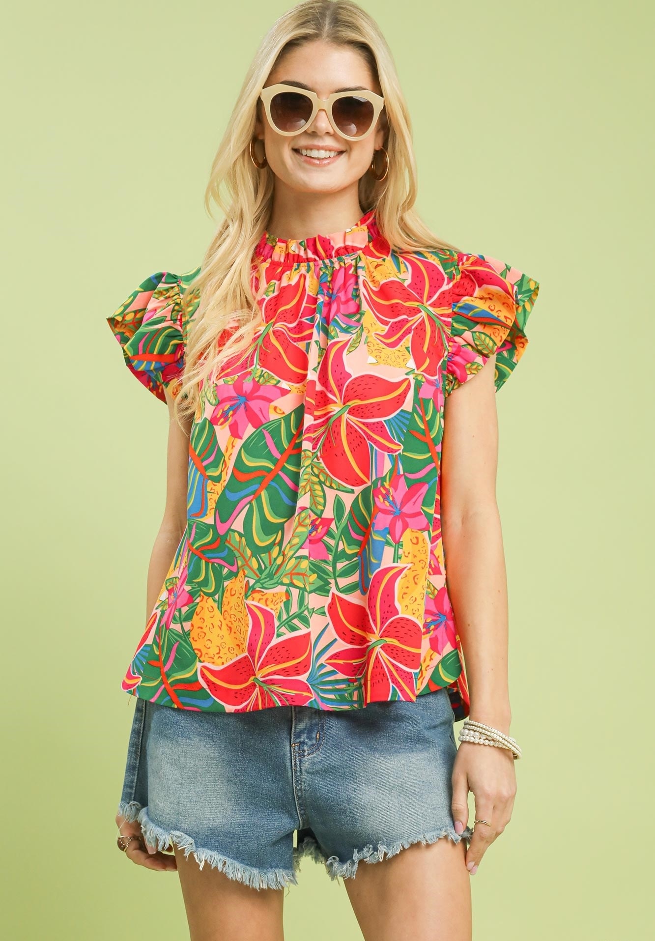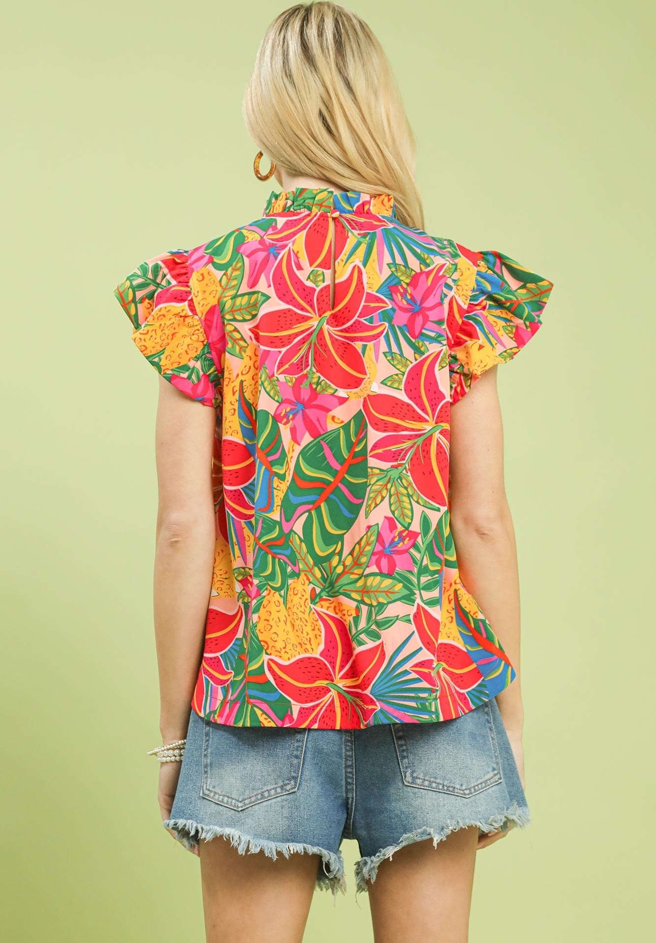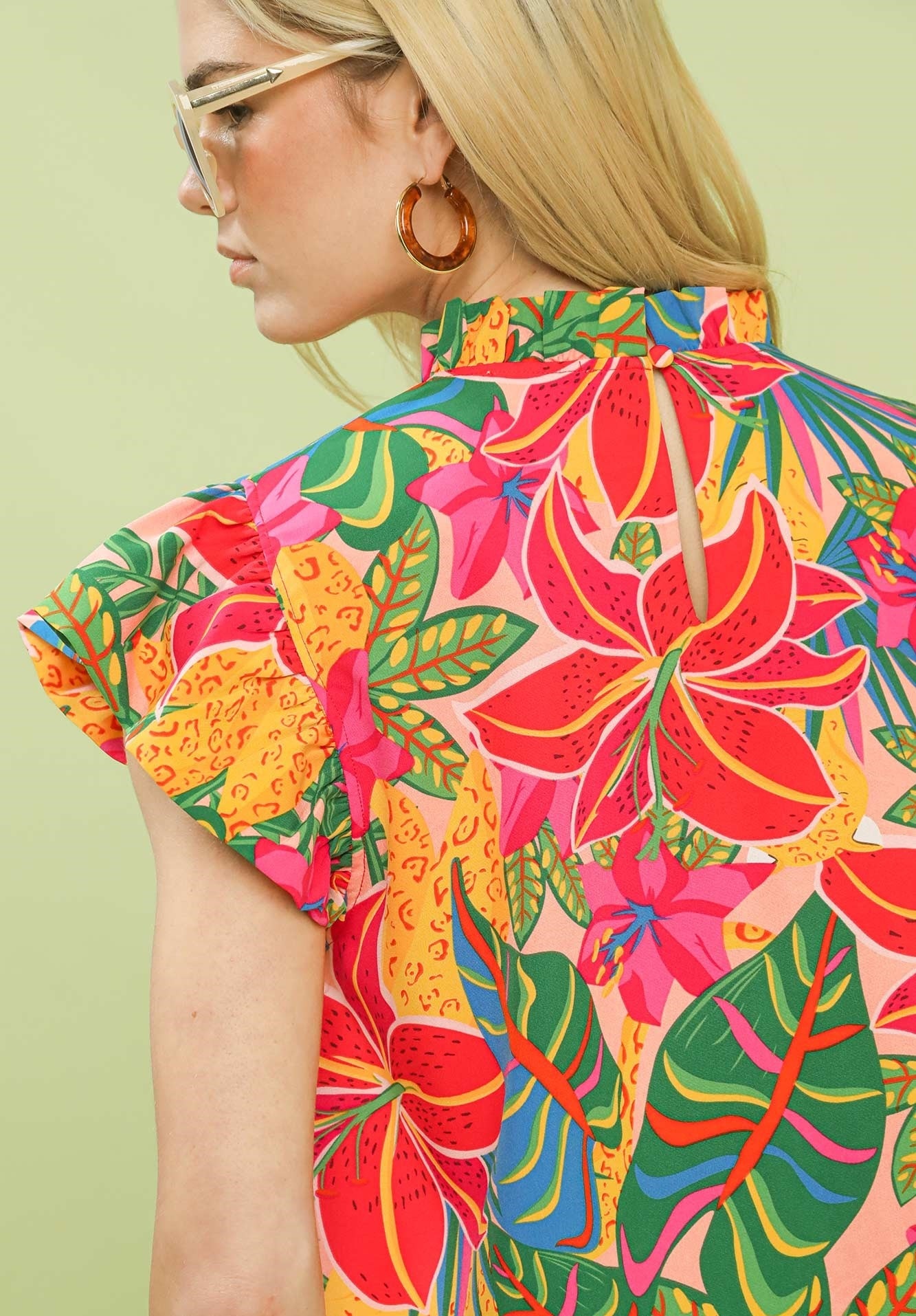 DetailsMulticolor tropical floral printHigh ruffle neckline with back keyholeShort ruffle sleevesNot Lined