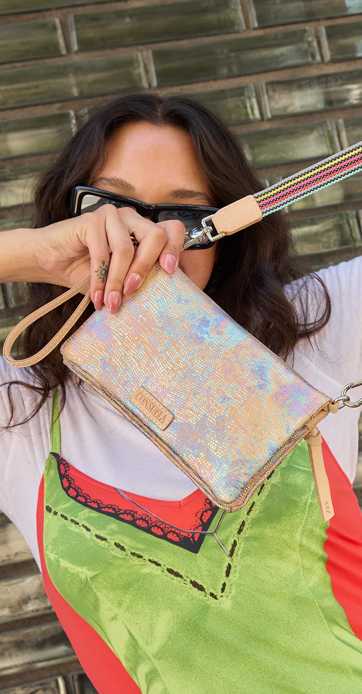 - Included detachable wristlet strap and adjustable woven crossbody strap