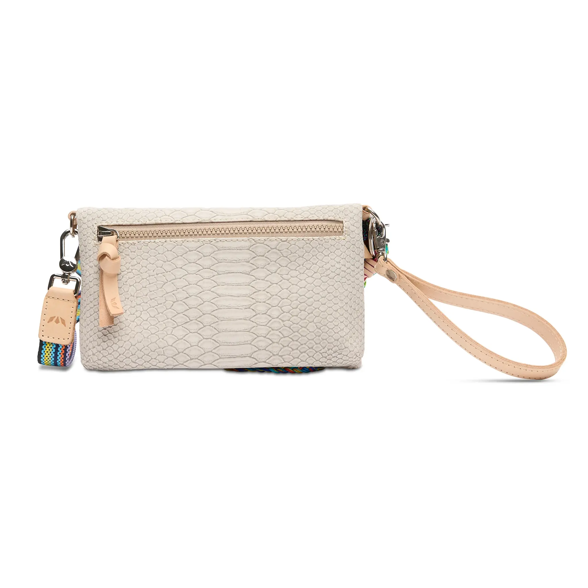 - Included detachable wristlet strap and adjustable woven crossbody strap