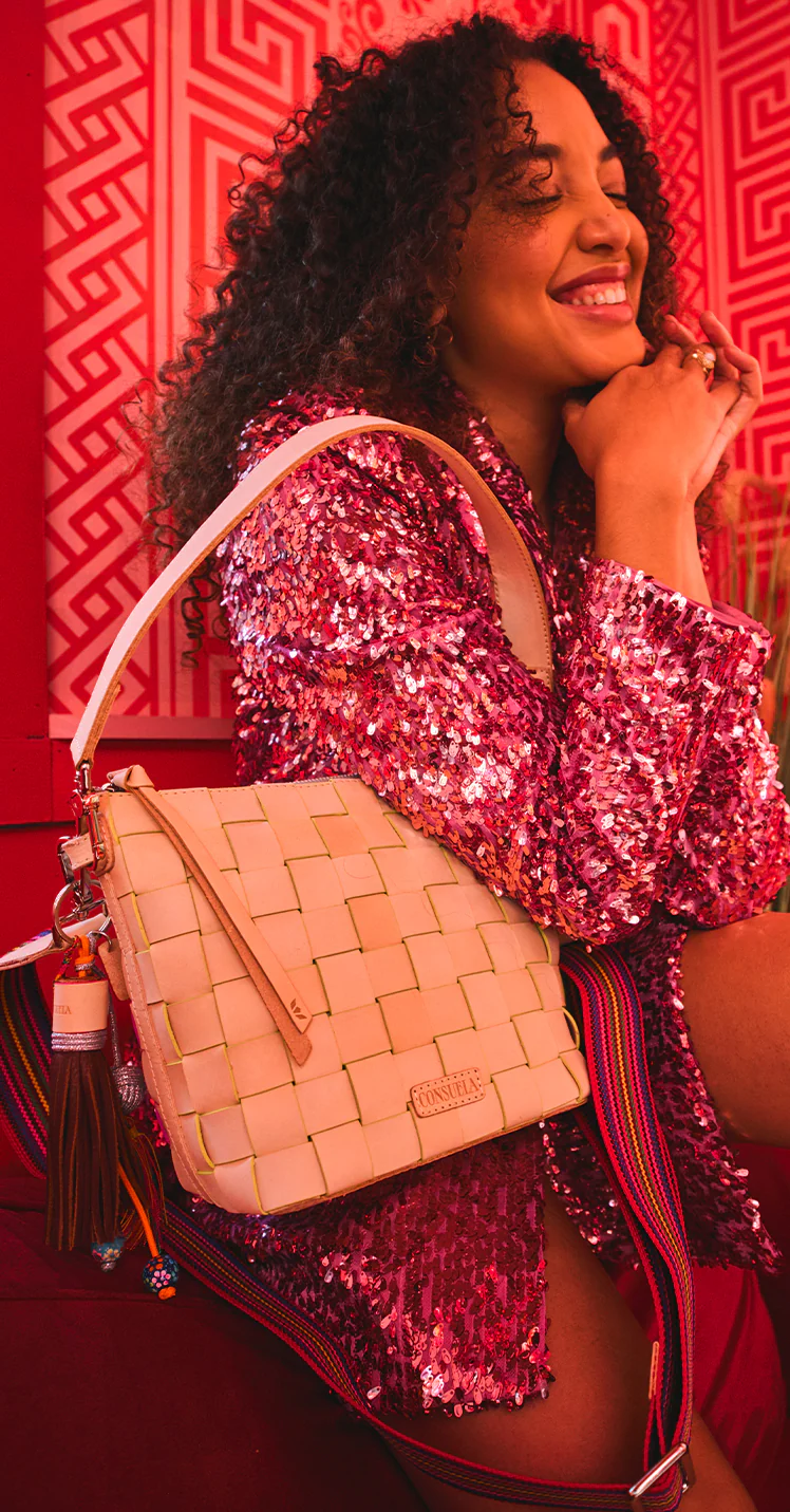 - Includes two detachable straps: a leather shoulder strap and an adjustable woven crossbody strap