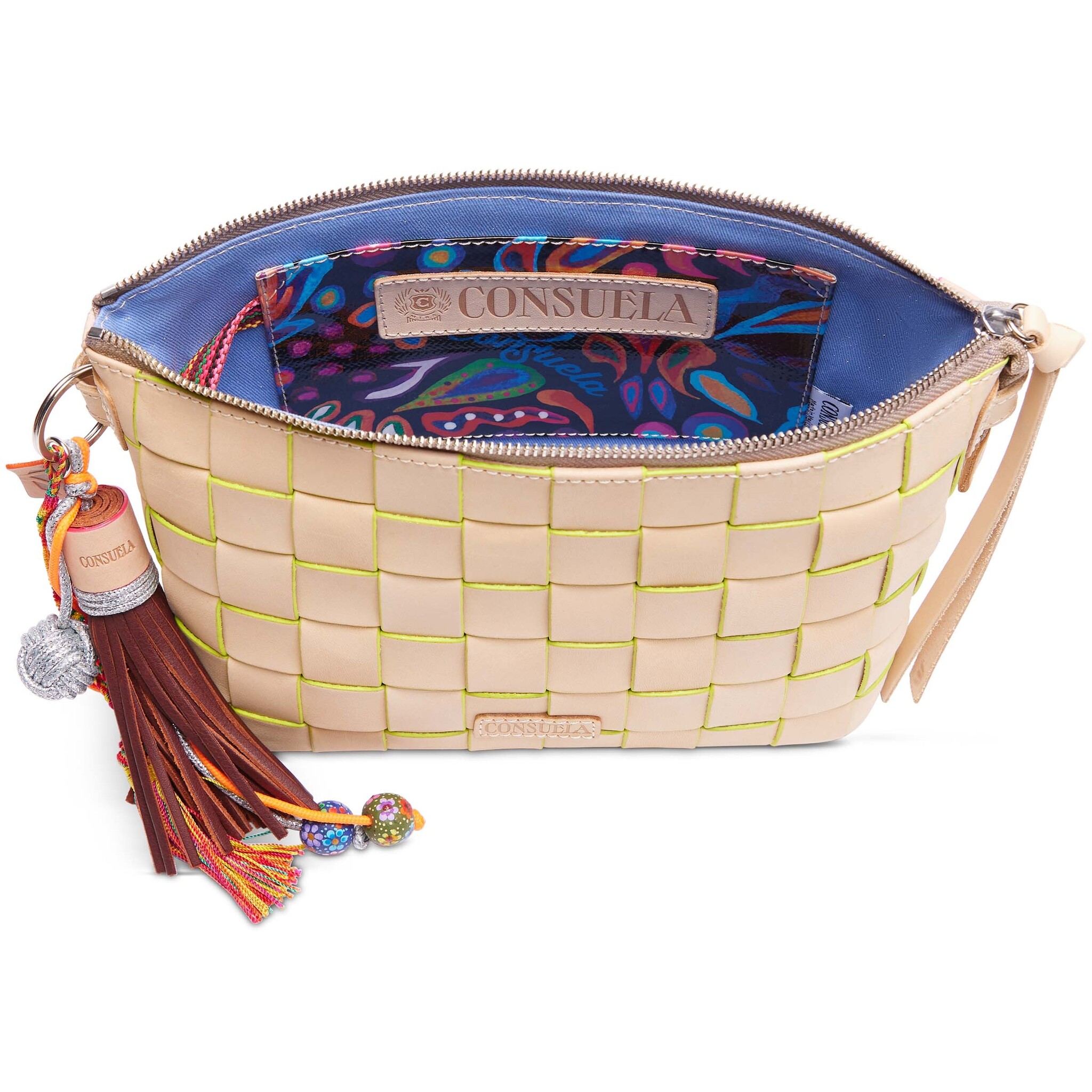 - Detachable natural leather strap that can be used as a shoulder strap or wristlet strap